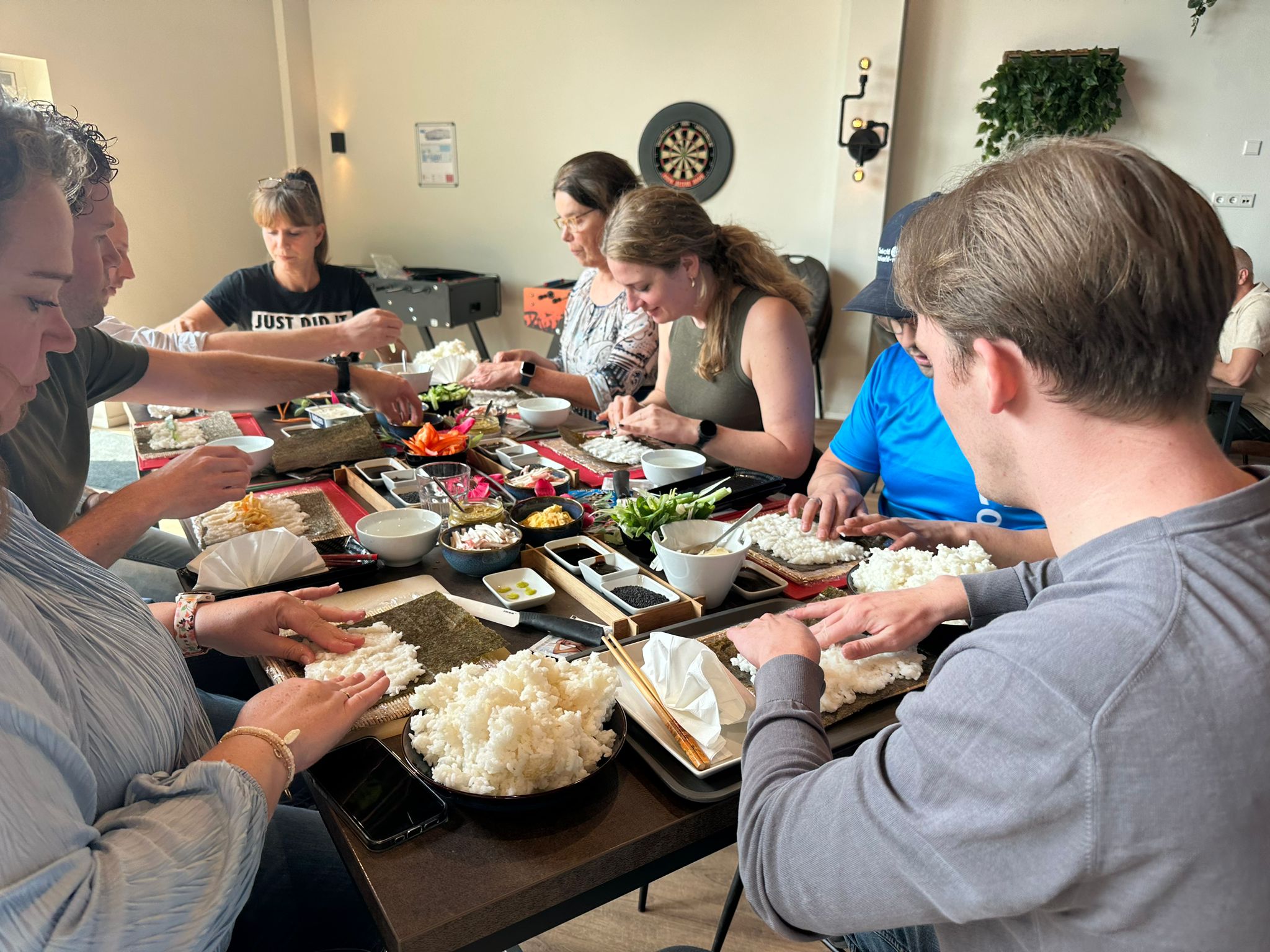 Wir organisieren regelmäßig Teamausflüge und Mini-Events. Diese reichen von sportlichen Aktivitäten bis hin zu kulturellen Ausflügen, immer mit dem Ziel, ein eng verbundenes und engagiertes Arbeitsumfeld zu schaffen. Außerdem gibt es einen jährlichen Kick-off, um den Teamgeist bei Coolworld zu stärken und Erfolge zu feiern. Auf dem Foto ist ein erfolgreicher Sushi-Workshop zu sehen, mal was ganz Anderes!